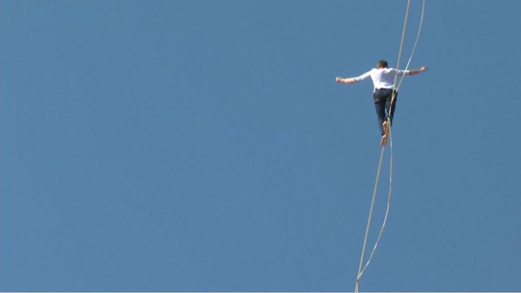 رحلة بولين بدأت على ارتفاع حوالي 100 متر في وقت متأخر من بعد ظهر الثلاثاء، واستغرقت نحو ساعتين على طول الحبل المشدود الذي لا يتجاوز عرضه السنتيمترين.