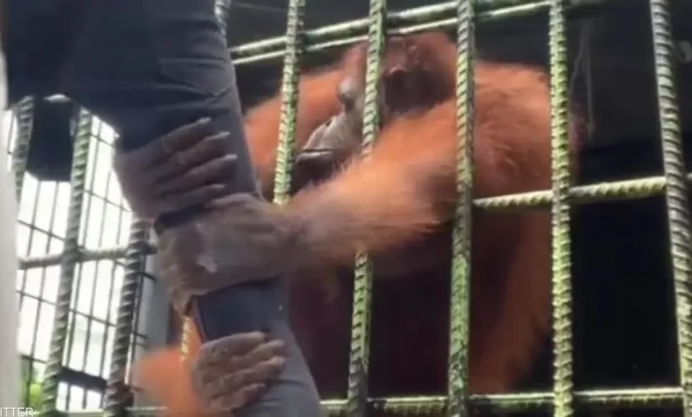 وفي حديقة حيوانات بإندونيسيا، أقدم شاب على “استفزاز” إنسان الغاب، بمد يديه بشكل قريب من القفص، قبل أن يسحبها بسرعة.