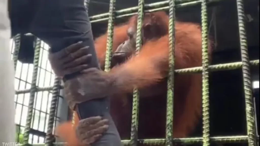 وفي حديقة حيوانات بإندونيسيا، أقدم شاب على “استفزاز” إنسان الغاب، بمد يديه بشكل قريب من القفص، قبل أن يسحبها بسرعة.