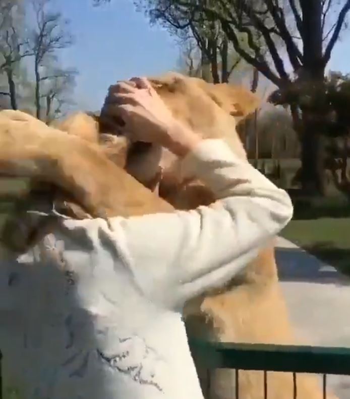 وبعد 7 سنوات كان اللقاء بين الأسدين والسيدة التي كانت تعتني بهما فكان العناق حاراً.