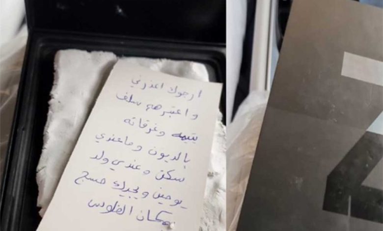 وتفاجئ المواطن الكويتي بالرسالة عندما اشترى لزوجته هاتفًا عبر الإنترنت من سوق داخلي، وفتح علبة الهاتف ليجد داخلها رسالة الاعتذار.