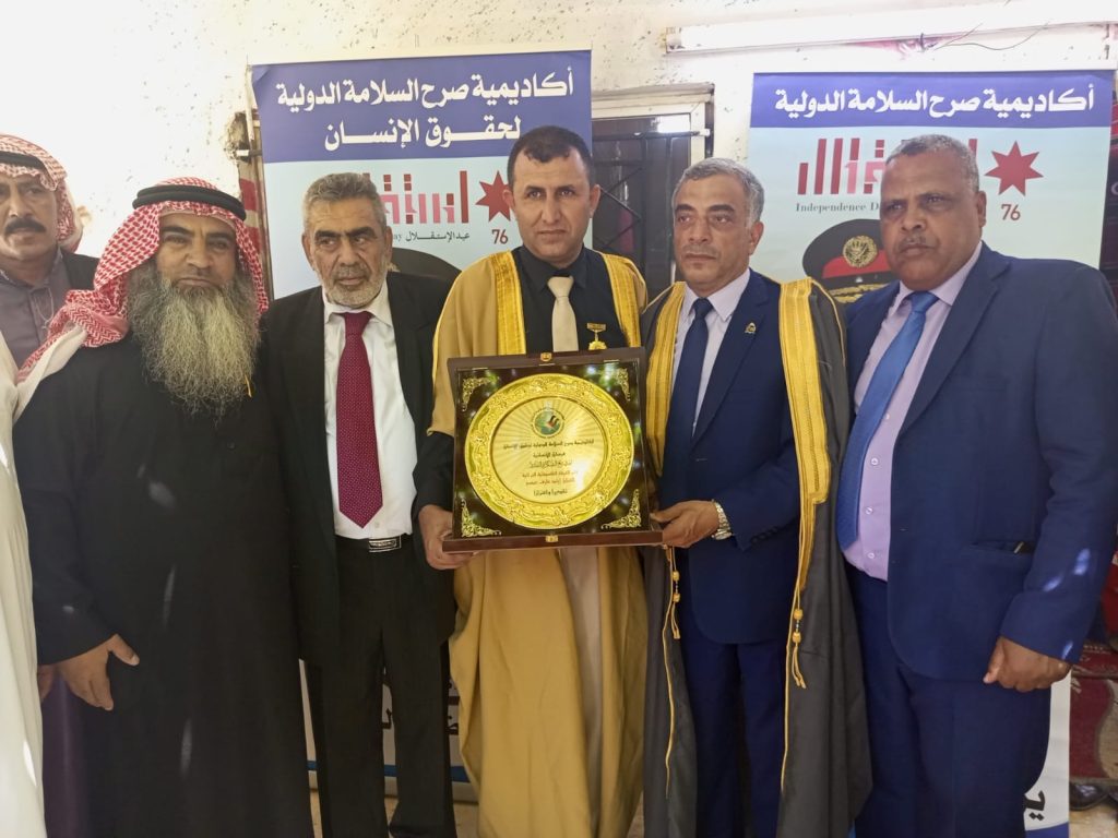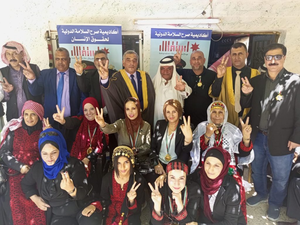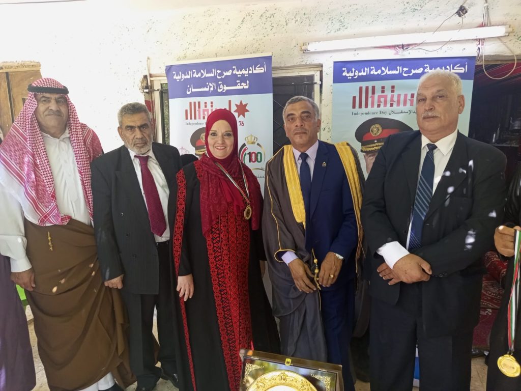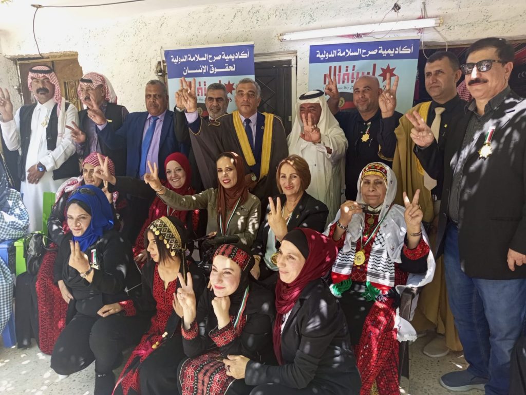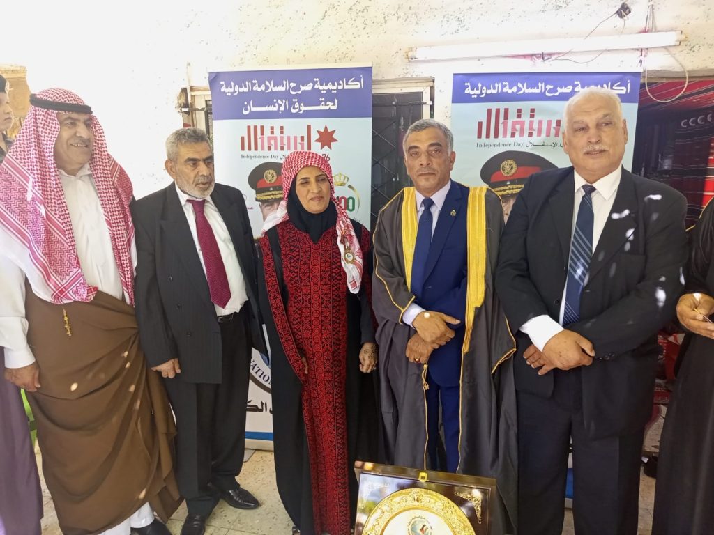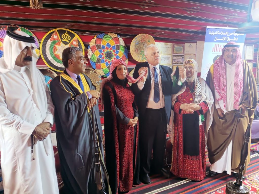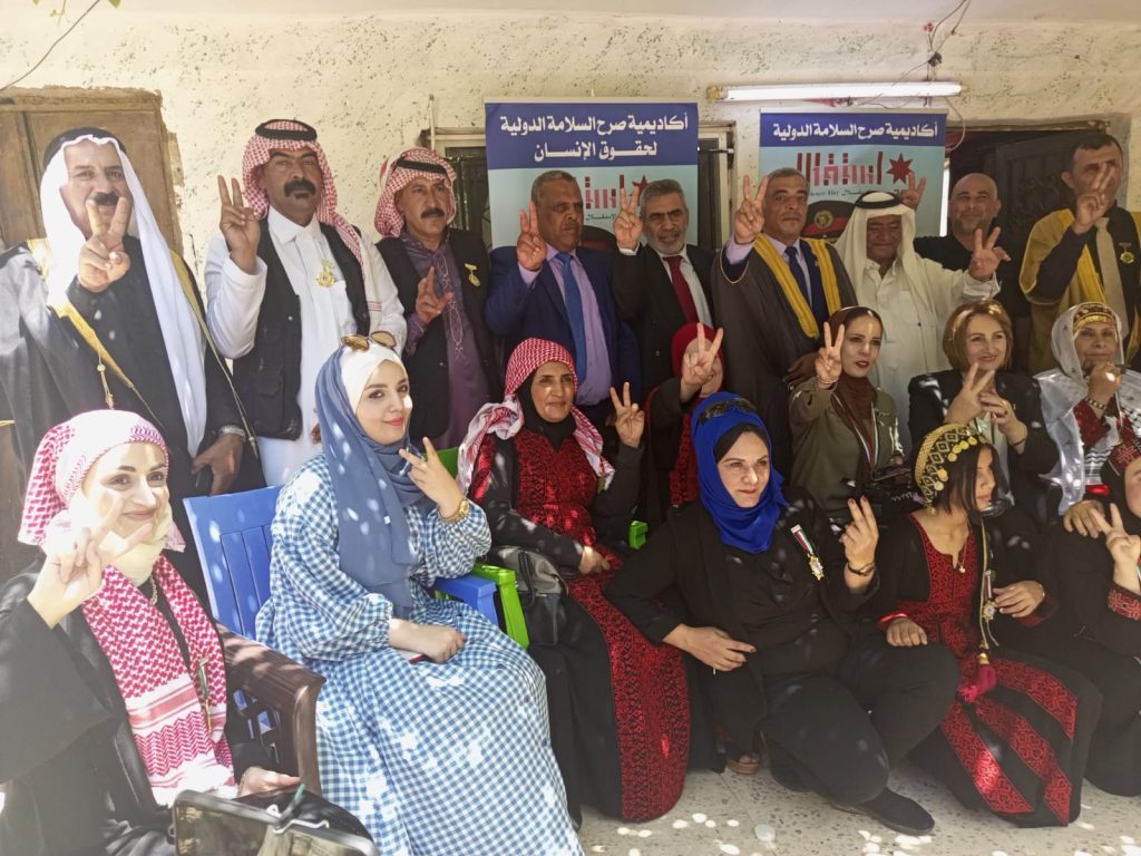 من الأردن وفلسطين وقال نحن في أكاديمية صرح السلامة الدولية لحقوق الإنسان نُكرم الانجاز والعطاء في هذا الوطن أينما كان ولهذا سعدنا بتكريم الفنان إياد عيسى وفرقته التراثية الفلسطينية ونستقبلهم اليوم في مضارب العجارمة في ناعور وهذا شرف كبير لناكوننا نؤمن بأننا نعيش معاً في ذات اللغة والانتماء والحب والتعاون .