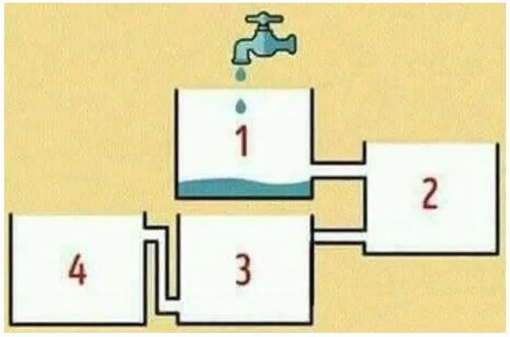تُظهر الصورة 4 خزانات منفصلة مع صنبور يقطر في الخزان المسمى “1”. وبعد النظر إلى مجموعة الأنابيب أو الوصلات المركبة لتوصيل المياه إلى الخزانات.. هل يمكنك رؤية الخزان الذي سيمتلئ بالماء أولاً؟