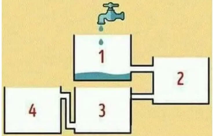 تُظهر الصورة 4 خزانات منفصلة مع صنبور يقطر في الخزان المسمى “1”. وبعد النظر إلى مجموعة الأنابيب أو الوصلات المركبة لتوصيل المياه إلى الخزانات.. هل يمكنك رؤية الخزان الذي سيمتلئ بالماء أولاً؟