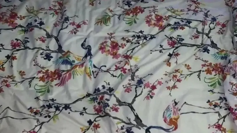 فالصورة التي تحتوي على الخدعة البصرية هي عبارة عن ملاءة سرير متعددة الألوان بها أشجار وطيور وزهور.
