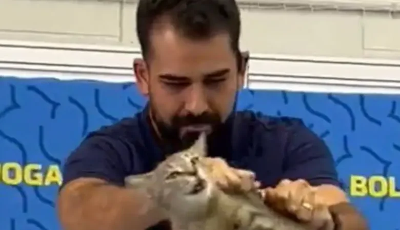 فما كان من أحد مسؤولي المنتخب البرازيلي إلا أن قام بإبعاد القطة عن المنصة بطريقة “قاسية”، ما أثار غضباً على مواقع التواصل.