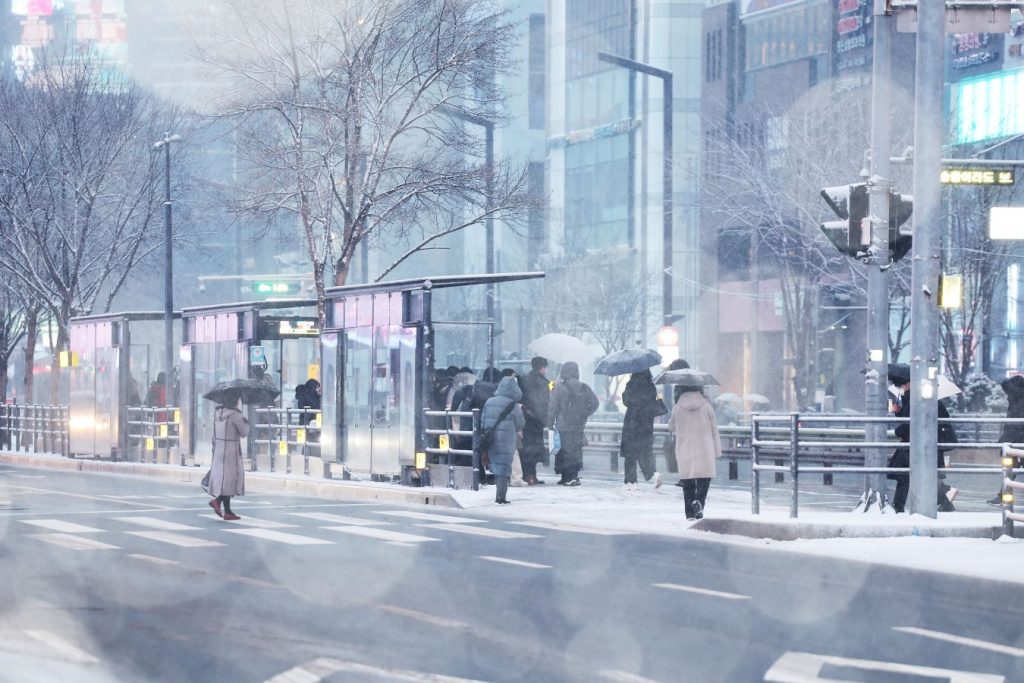 قالت وكالة الأرصاد الجوية الحكومية إن الثلوج ستستمر في التساقط في منطقة العاصمة سيئول وضواحيها والمناطق الوسطى إلى ما بعد ظهر اليوم الأربعاء، وتوقعت أن يصل تساقط الثلوج إلى ارتفاع 15 سم.