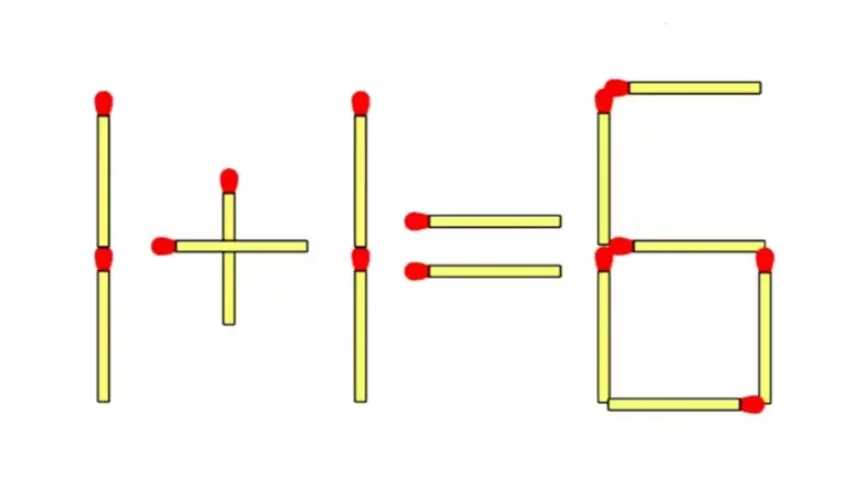 1 + 1 = 6 .. انقل عصا واحدة من ستة وأبعد عصا أخرى من ستة كما هو موضح في الصورة أدناه.