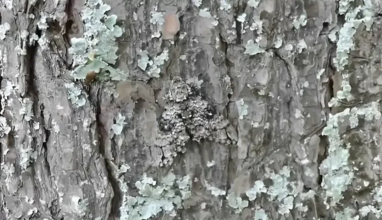 ها هي حشرة العثة في وسط الصورة. يتشابه لونها مع لحاء الشجرة مما يجعل من الصعب التعرف على مكانها للوهلة الأولى. لكن مع بعض التركيز يمكنك الوصول لمكانها.