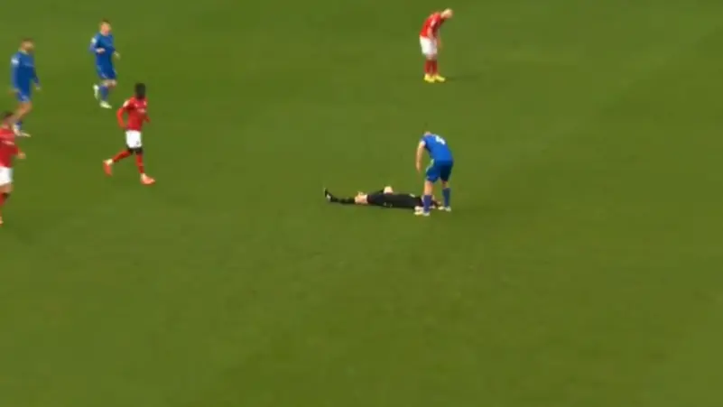 شهدت مباراة فريقي “سويندون” و”غريمسبي” في دوري الدرجة الرابعة الإنجليزي لكرة القدم، السبت، حادثة غريبة. فقد تعرض الحكم سام بيركيس لإصابة في رأسه، أجبرته على ترك الملعب.