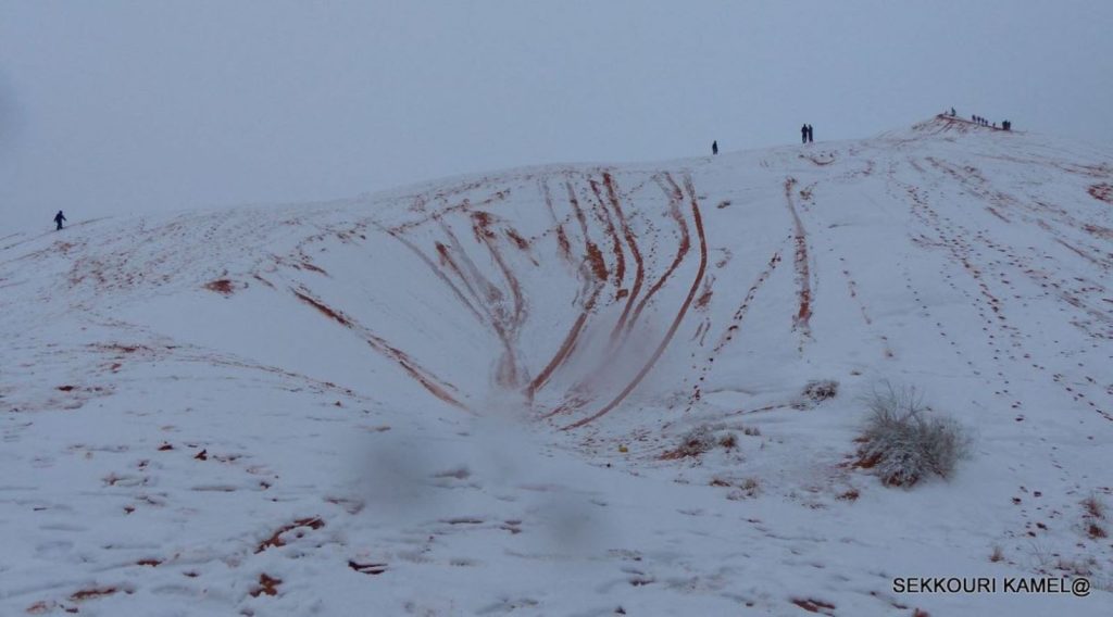 وقالت صحيفة ” النهار” في موقعها الإلكتروني إن ولاية بشار شهدت ظاهرة نادرة جدا تمثلت في تساقط كميات من الثلوج وسط الصحراء خاصة بمنطقة بني ونيف.