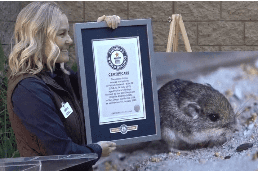 وأعلن تحالف سان دييغو للحيوانات البرية بعد احتفالية منح الشهادة، أن فأر جيب المحيط الهادئ المسمى “بات” – على اسم ممثل سلسلة أفلام “ستار تريك” باتريك ستيوارت – حصل على موافقة موسوعة غينيس، الأربعاء، باعتباره أكبر فأر حي سنا تحت رعاية الإنسان، إذ يبلغ من العمر 9 سنوات و209 أيام.