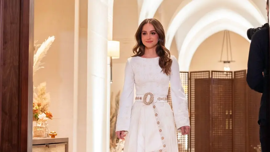 الملكة رانيا تضع اللمسات الأخيرة على ثوب الحناء الخاص بابنتها والذي يحمل تفصيلاً من ثوب زفافها على شكل حزام.