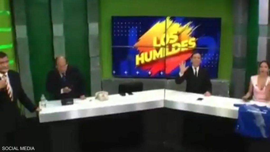 ويظهر في الفيديو أشخاص يشاركون في برنامج حواري على إحدى القنوات التلفزيونية في الإكوادور.
