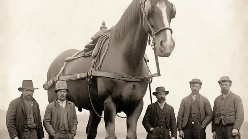 ويظهر في الصورة حصان يتجاوز ارتفاعه 5 أمتار، مقارنة مع الرجال الواقفين بجانبه وقال ناشرو الصورة إنّها “صورة نادرة لأكبر حصان في التاريخ”.