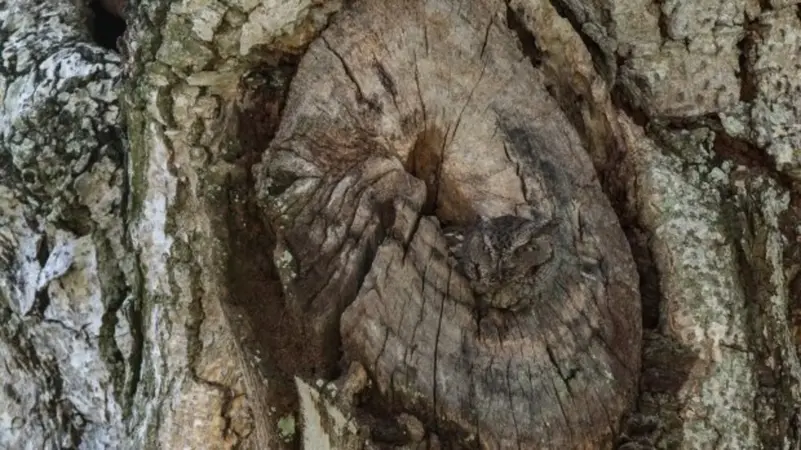 ما يبدو للناظر جذع شجرة عاديا يحتوي بومة مختبئة بداخله. وإذا تمكنت من اكتشاف البومة فلديك عيون صقر.