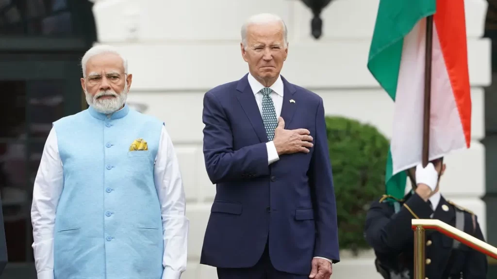 بايدن خلال استقباله رئيس الوزراء الهندي (رويترز)