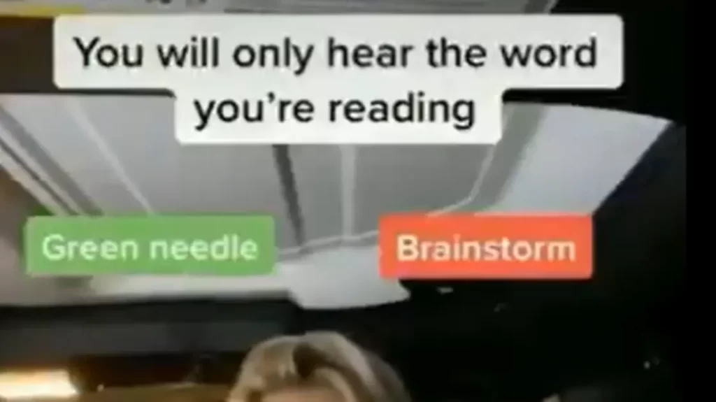 والفيديو يخيّر المشاهد بين كلمتي “العصف الذهني” (Brainstorm) أو الكلمات “الإبرة الخضراء” (Green Needle)، ويبدو أن الكلمة التي تسمعها تعتمد على العبارة التي تقرأها على الشاشة أو حتى الكلمات التي تفكر فيها.
