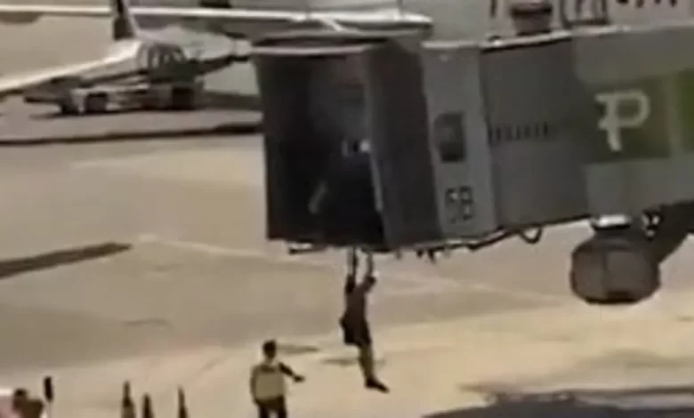 وتبين من اللقطات المتداولة أحد المسافرين يقفز من على علو بضعة أمتار من الممر المخصص لنقل الركاب إلى أرض المطار، من دون أن يلحق به أي أذى، فيما علق الآخر في الممر وتم سحبه.