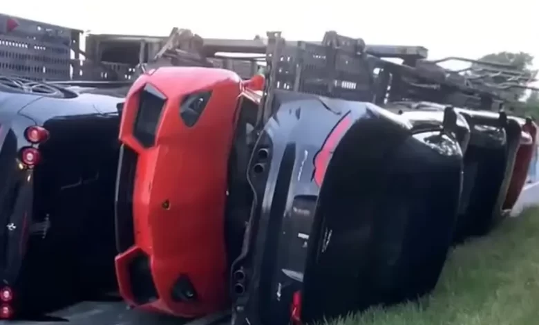 بينها أستون مارتن ولامبورغيني.. شاحنة تحمل سيارات فارهة تنقلب على الطريق