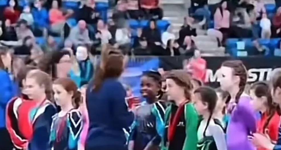 ويظهر الفيديو، الذي تم التقاطه في مارس من العام الماضي خلال مسابقة في أيرلندا، تشكيلة من لاعبات الجمباز صغيرات السن في انتظار تسليمهن ميدالياتهن.