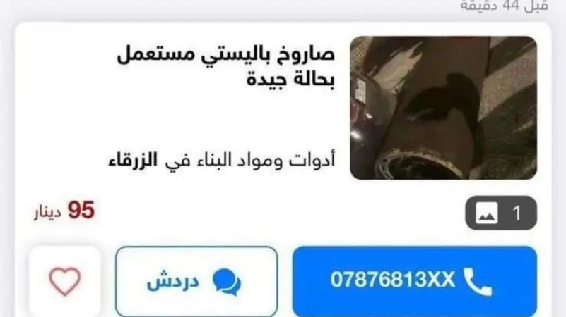 وعرض مواطنون حطام الصواريخ التي سقطت على مناطق الحسا، ومرج الحمام، ومحافظة الكرك للبيع على موقع “السوق المفتوح” الشهير والمختص ببيع المركبات والعقارات وكافة أنواع السلع، بأسعار متفاوتة.