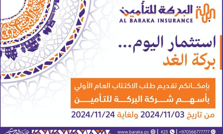 أعلنت شركة البركة للتأمين الإسلامي المساهمة العامة عن طرح أسهمها للاكتتاب العام الأولي، بعد حصولها على الموافقة من هيئة سوق رأس المال الفلسطينية في 17 تشرين أول الماضي، وبلغ عدد الأسهم المقرر طرحها في الاكتتاب 2,250,000 سهماً بسعر 1 دولار أمريكي للسهم والواحد، وتمثل نسبة الأسهم المطروحة 37.5% من رأس المال المصرح به والذي يبلغ 6,000,000 دولار أمريكي، وستستمر فترة الاكتتاب لمدة 23 يوم من صباح اليوم الأحد 3 تشرين ثاني ولغاية مساء يوم الأحد 24 تشرين ثاني من العام 2024.