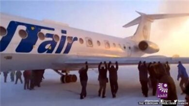 الركاب ينزلون من الطائرة ويدفعونها بايديهم بسبب تجمدها