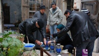 بالصور.. سلاف فواخرجي” فلاحة” بعصبة بيضاء في “المصابيح الزرق”