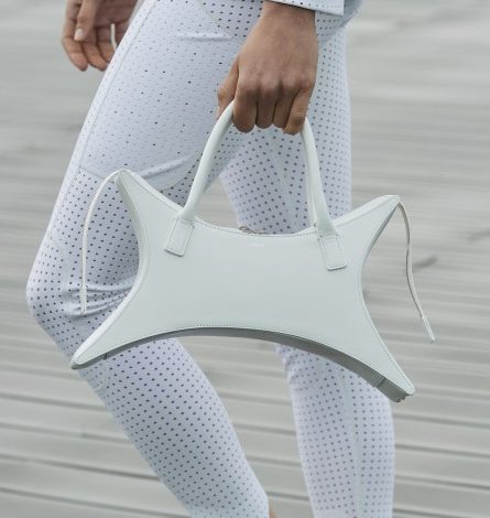 وصُممت الشنطة بحجم متوسط مع يد بيضاء من الجلد الأبيض، تتصل بحزام عريض يلتف حول الشنطة بتصميم جلد التمساح باللونين الأبيض والأسود.