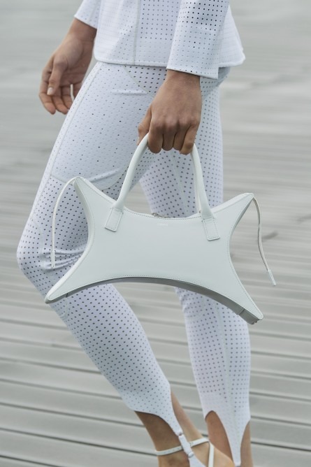 وصُممت الشنطة بحجم متوسط مع يد بيضاء من الجلد الأبيض، تتصل بحزام عريض يلتف حول الشنطة بتصميم جلد التمساح باللونين الأبيض والأسود.