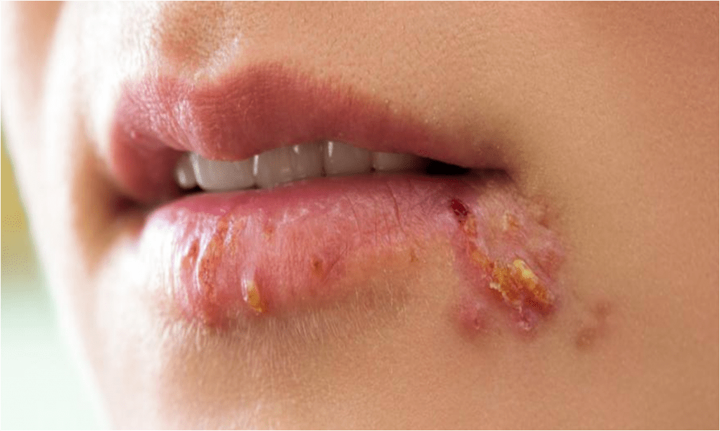 وروى الأطباء بعض أعراض مرض الهربس والتي تتمثل بظهور بثور مؤلمة أو تقيّحات مفتوحة تُسمّى قرحات في الفم أو حوله. وكذلك الشعور بوخز أو حكة أو حرقان حول الفم قبل ظهور التقيّحات والقروح على الشفاه أو اللسان أو سقف الفم أو اللثة مع بثور مملوءة بالسوائل الملوثة.
