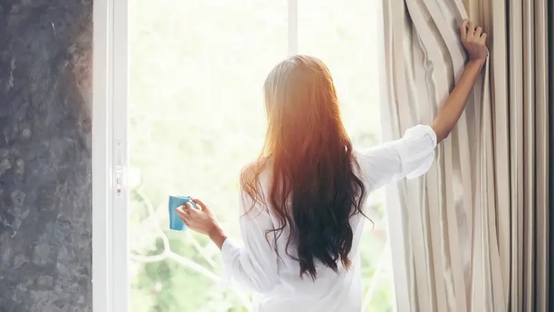 افتح الأبواب والنوافذ، ودع ضوء الشمس ينساب لبضع دقائق إلى داخل الغرف، فذلك يساعد على بدء الصباح بنشاط ويساعد في إنقاص الوزن.