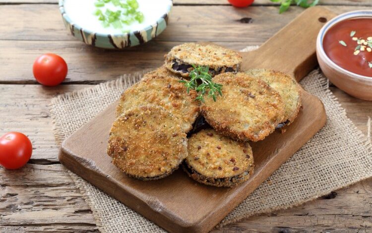 - غمّسي الباذنجان بالدقيق، ثم بالبيض، ثم بالبقسماط.