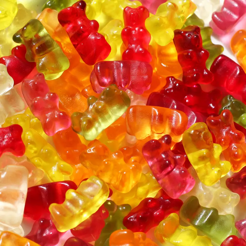 مثل الدببة الجيلاتينية والحلوى المطاطية الحامضة، ويبدأ تصنيعها كسائل ثم تتماسك بفضل الجيلاتين لتعطي القوام المطاطي المعروف.