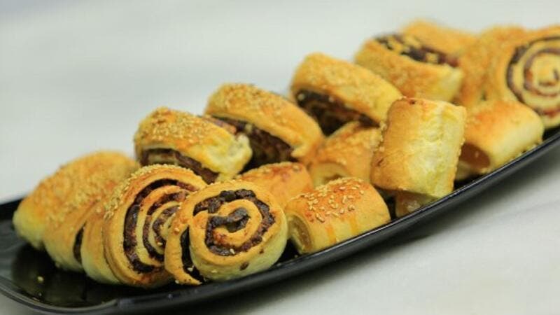 إفردي العجينة على لوح مرشوش وقطعيها مستطيلات على شكل شرائط بعرض 7 سم وضعي حشوة التمر ولفي على شكل اسطوانة.