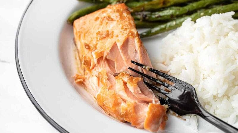 اخبزي السلمون لمدة 20 دقيقة (15 دقيقة للفيليه الرقيق) أو حتى تصل درجة الحرارة الداخلية إلى 145 درجة فهرنهايت. قدميها على الفور.