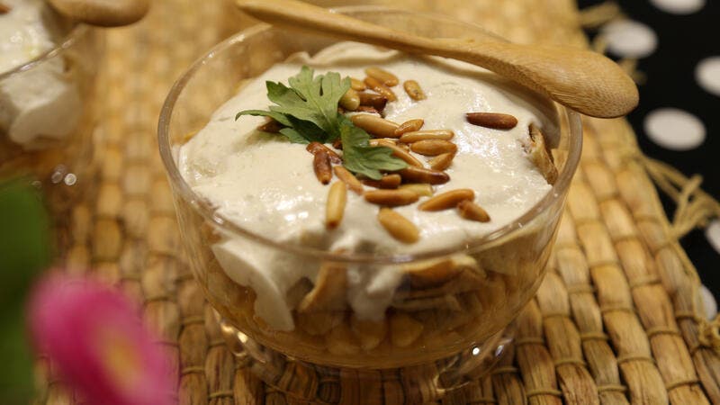 ثم تقدم فتة الحمص في جاط بايركس وتزين باللحمة المفرومة واللوز أو الصنوبر.