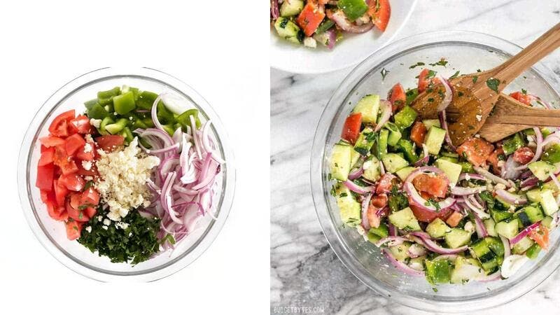 ضعي الخيار والطماطم والفلفل والبصل الأحمر والبقدونس والفيتا في وعاء كبير. نسكب الصلصة على الوجه ونقلب المزيج. قدميها على الفور أو ضعيها في الثلاجة حتى تصبح جاهزة للأكل. هذه السلطة تبقى جيدة لبضعة أيام في الثلاجة. تأكدي من التقليب لفترة وجيزة لإعادة توزيع النكهات قبل التقديم.