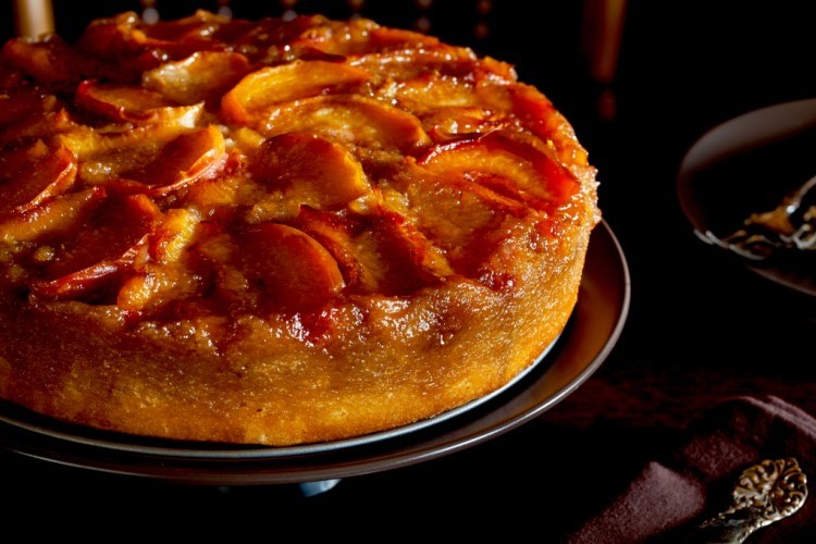 صبي الخليط في قالب مدهون ومجهز بورق الزبدة وضعي على سطح الخليط شرائح الدراق ورشي ملعقتين السكر المتبقية ثم اخبزي القالب في وسط الفرن على حرارة 350 مئوية لمدة 50 دقيقة حتى ينضج تماماً.