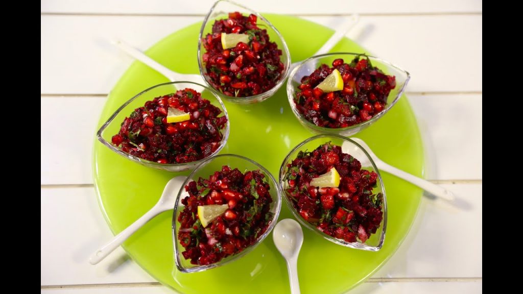زيني طبق التبولة بالشمندر، والرمان، والبصل الأخضر، والبرغل بحسب الرغبة، وقدميه فوراً.