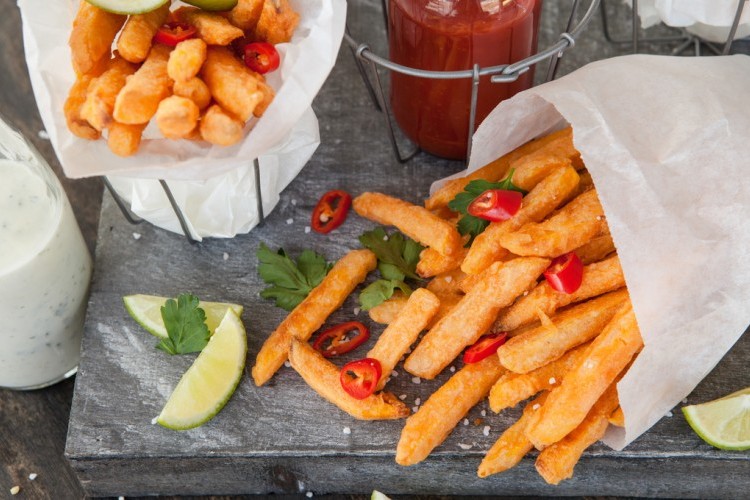 - في وعاء ضعي أصابع البطاطس، الملح، الفلفل الأسود والبابريكا.
