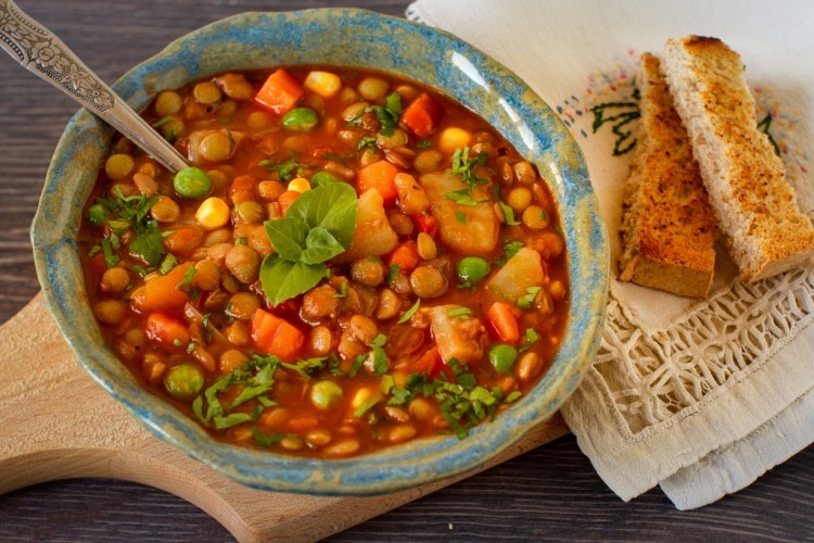 - أضيفي البطاطس والعدس المسلوق والطماطم والماء ونصف كمية البقدونس وقلبي قليلاً واتركي المزيج لمدة 5 دقائق حتى يغلي.