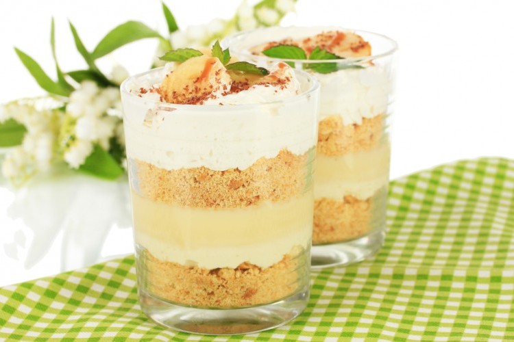 - نسكب القليل من الكريمة في قاع صينية مستطيلة، أو في أكواب ونضع البسكويت في الحليب مع الفانيليا، ونرص قطع البسكويت لعمل طبقة أولى في الصينية، ثم نضع طبقة من الكريم كراميل.