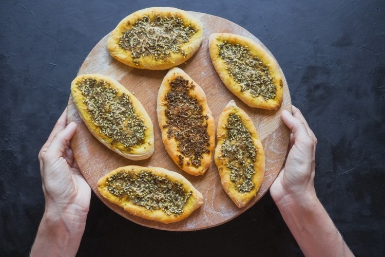 - لتحضير الحشوة: قطعي العجينة إلى كرات صغيرة، ثم مديها باستخدام النشابة حتى تصبح دائرة صغيرة، ووضع قليل من الجبن والزيتون والزعتر في وسط العجينة.