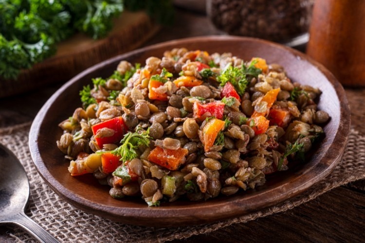 - اسكبي صوص الليمون على العدس والخضار، وقلبي المكونات حتى تتجانس وتتوزع، ثم قدمي السلطة فوراً.