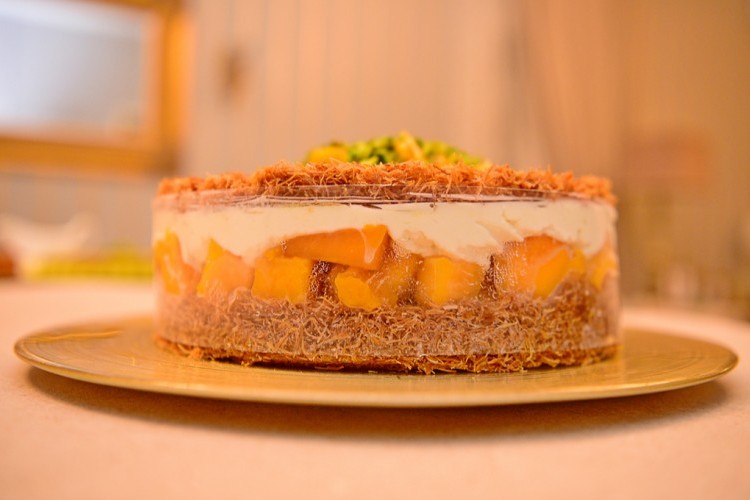 - ضعي فوقها طبقة من الكنافة وأعيدي الكرة لعمل طبقتين أو ثلاث حسب الرغبة.