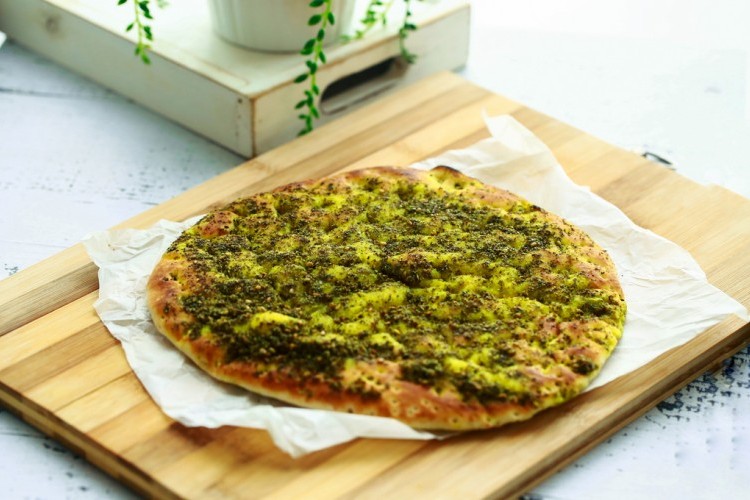 لتحضير العجينة: ضعي الدقيق والملح، والخميرة في وعاء واخلطي المكونات حتى تتداخل ثم أضيفي الماء تدريجياً وادعكي المزيج حتى تحصلي على عجينة وغطي الوعاء بورق نايلون لاصق واتركيه جانباً حتى ترتاح العجينة.