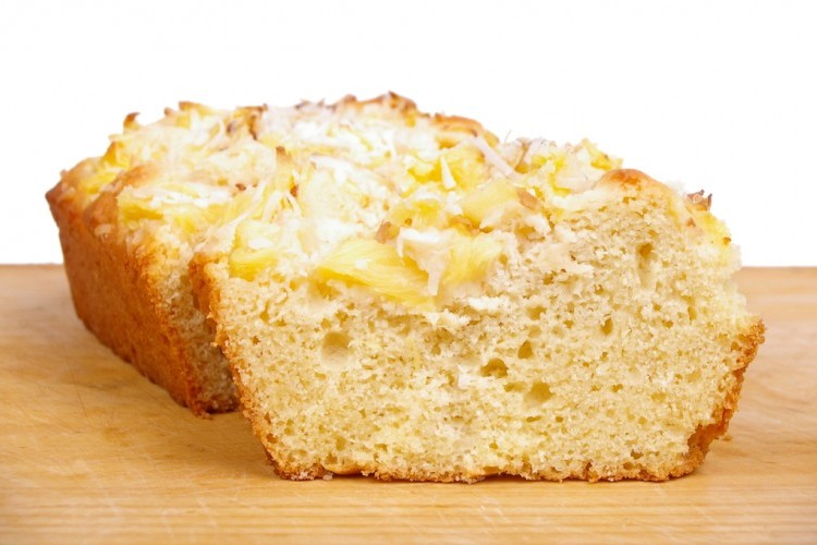 - اسكبي المزيج داخل القالب، ثم وزعي شرائح الأناناس على الوجه ورشي جوز الهند الطازج.