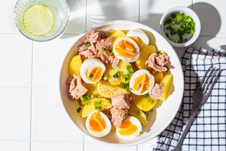 - قطّعي البطاطس والبيض، ثم وزعيها فوق التونة، ثم أضيفي الطماطم المجففة، وجبن البارميزان.